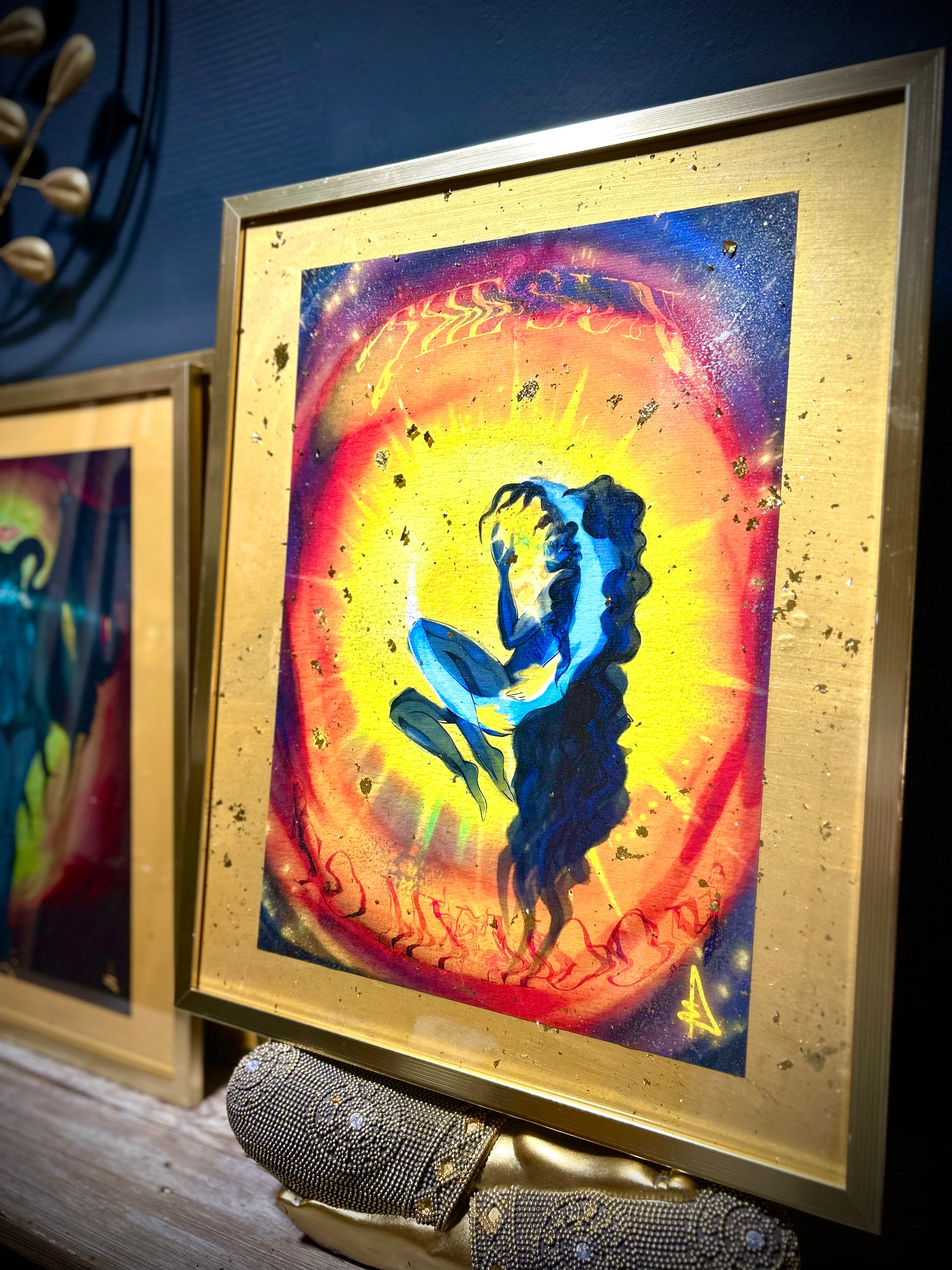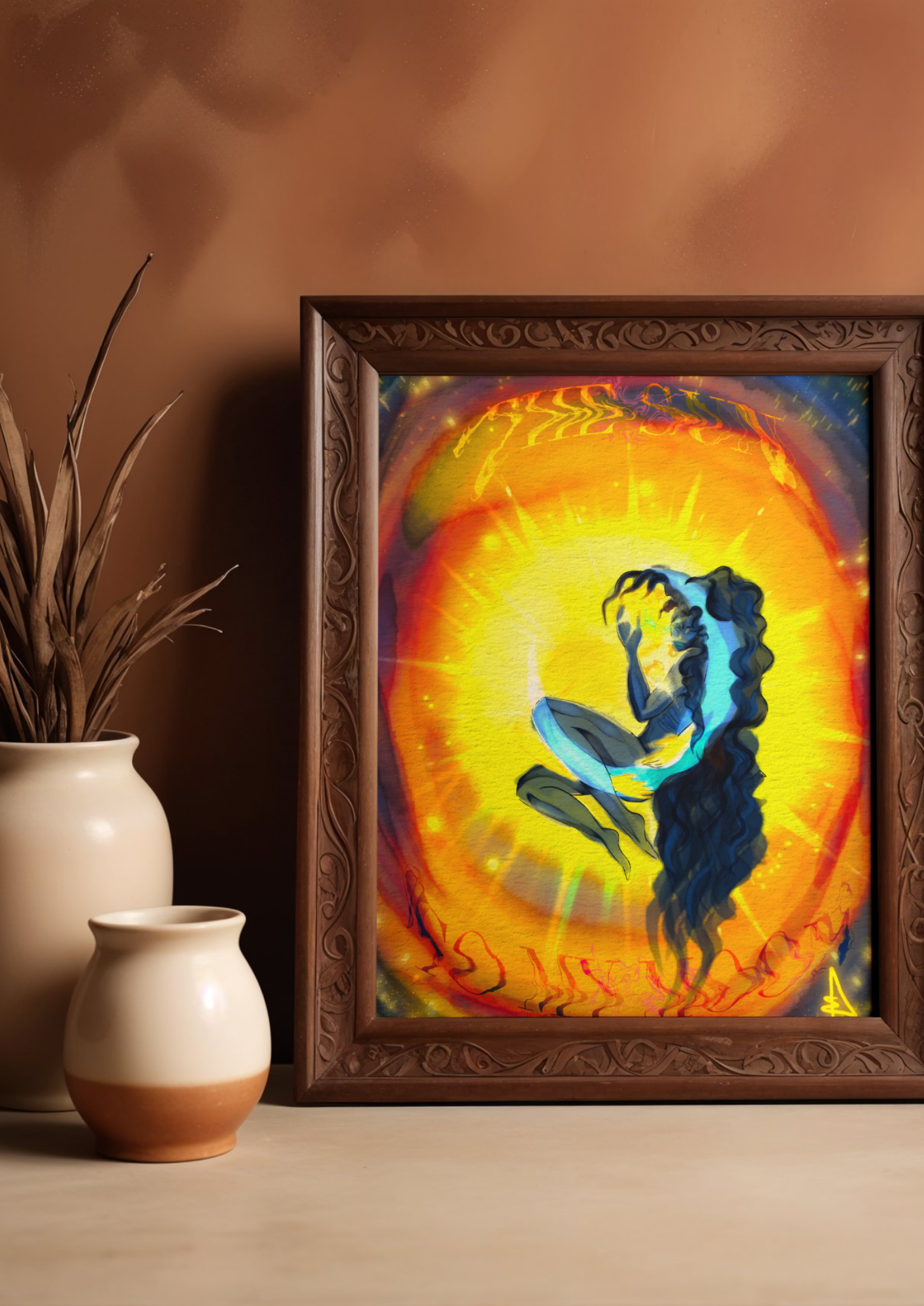 Here the intimate embrace between a moon and a sun. The young woman embraces the sun with a serene smile, merging her nocturnal calm with the radiant force of her sun. He appears solid, reassuring, vibrant with a warm light. The two figures float in a colorful void, as if suspended out of time, symbolizing the balance between shadow and light, gentleness and power, feminine and masculine. The work explores the harmony of polarities and how they complement each other to create a deeply energetic and universal union.